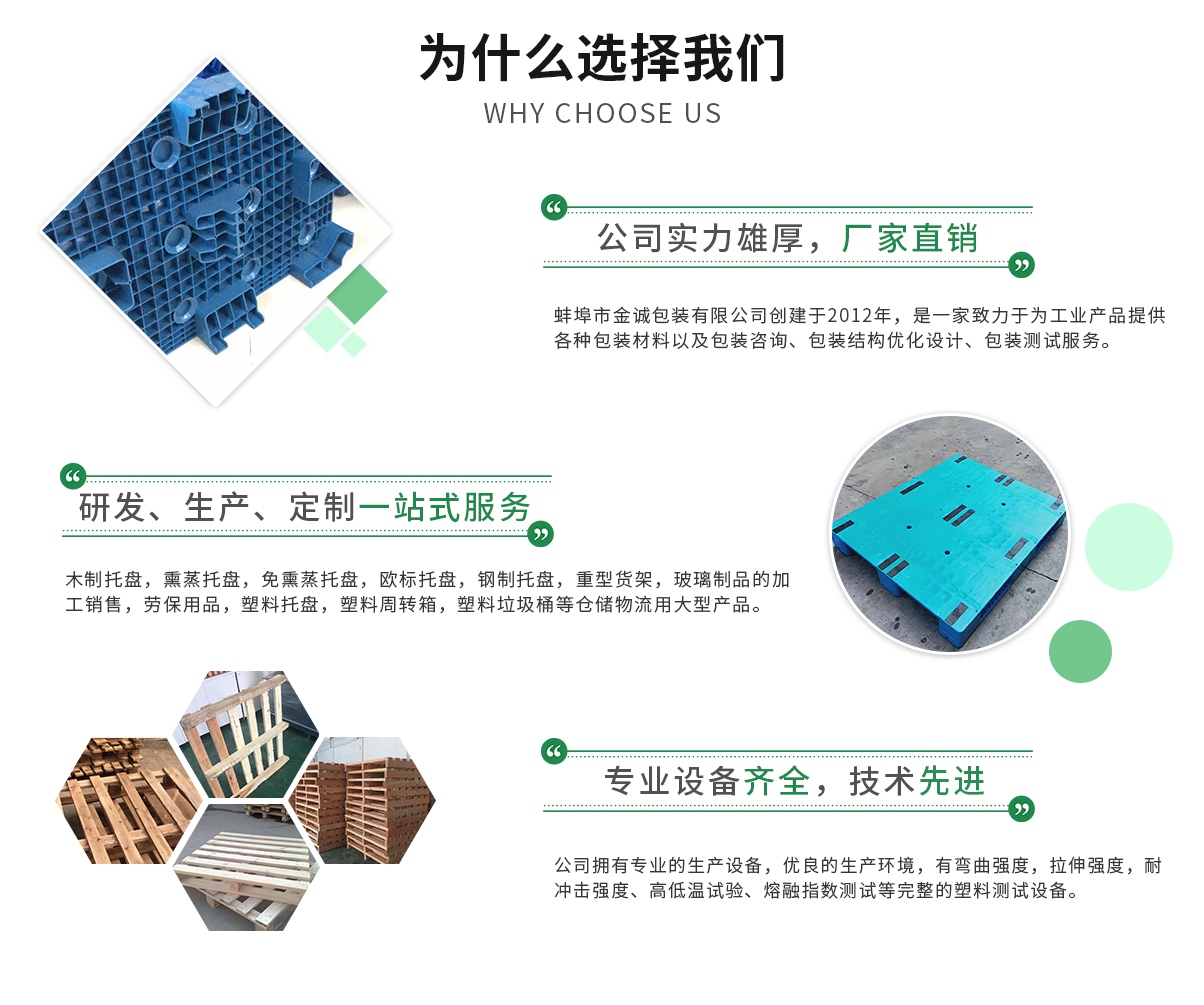 蚌埠市金誠包裝有限公司創建于2012年,是一家致力于為工業產品提供各種包裝材料以及包裝咨詢、包裝結構優化設計、包裝測試其中包括木制托盤,熏蒸托盤,免熏蒸托盤,歐標托盤,鋼制托盤,重型貨架,玻璃制品的加工銷售,勞保用品...